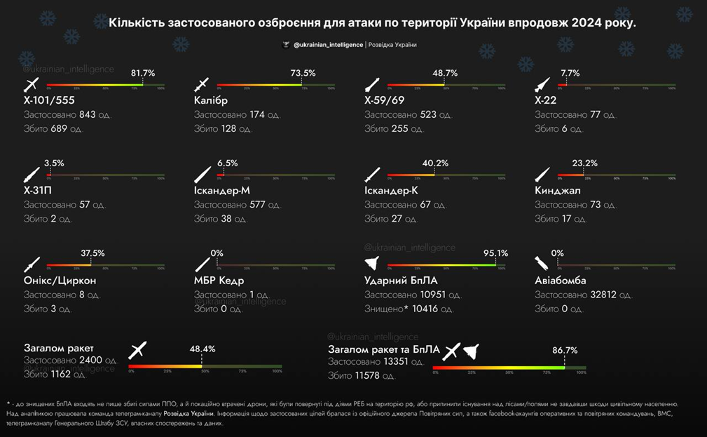 у 2024 році протиповітряною обороною знищено понад 1300 ракет різних типів, 11200 ударних безпілотників, 3200 розвідувальних БпЛА оперативно-тактичного рівня;