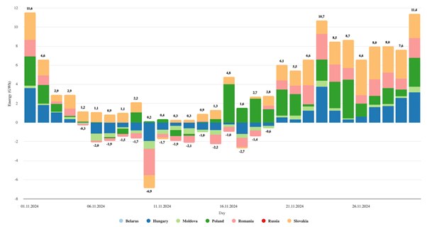 Найбільший добовий імпорт склав 12 000 МВт∙год 1 листопада, а найменший – 1000 МВт∙год 10 листопада. Середньогодинний імпорт електроенергії під час вечірнього піку в листопаді становив 470 МВт, що становить 27,6% від загальної технічної потужності 1700 МВт.