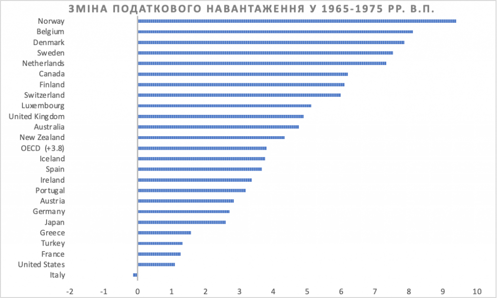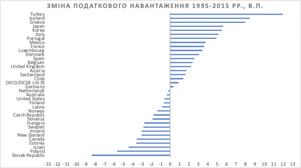 Загалом за 50 років, з 1965 по 2014 рр., середній рівень податкового навантаження у країнах ОЕСР зріс з 24,8% до 34,2%[16].