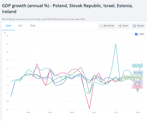 Але якщо до кінця 2000-х усі країни переважно підвищували податки, то потім зрештою з’явилися ті, що пішли проти тренду – країни, що почали знижувати податкове навантаження, зокрема – Словаччина, Польща, Ізраїль, Естонія, Ірландія. І так, в період зниження податкового навантаження ці країни демонстрували кращі темпи економічного зростання.