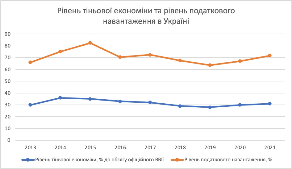 Згідно попередніх розрахунків Міністерства розвитку економіки України рівень тінізації економіки у 2021 році склав 31% від обсягу офіційного ВВП[19].
