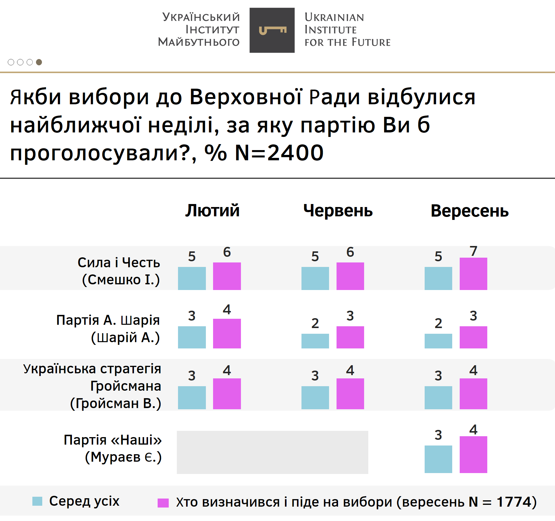 Не подолали п’ятивідсотковий бар’єр в абсолютних показниках, отримавши по 4% серед тих, хто визначився і піде на вибори, партії «Українська стратегія Гройсмана» і Є. Мураєва «Наші». Також «Партія А. Шарія» й «Партія Притули» – кожна отримала по 3% серед тих, хто визначився і піде на вибори. І партія «Голос» одержала 2% серед тих, хто визначився і піде на вибори. У порівнянні з настроями респондентів щодо участі у президентських виборах, частка охочих голосувати за народних депутатів є трохи нижчою – 70% заявляють про своє бажання голосувати на парламентських виборах. Проте 25% не підуть на парламентські вибори й не будуть голосувати. І ще 5% громадян не визначилися.