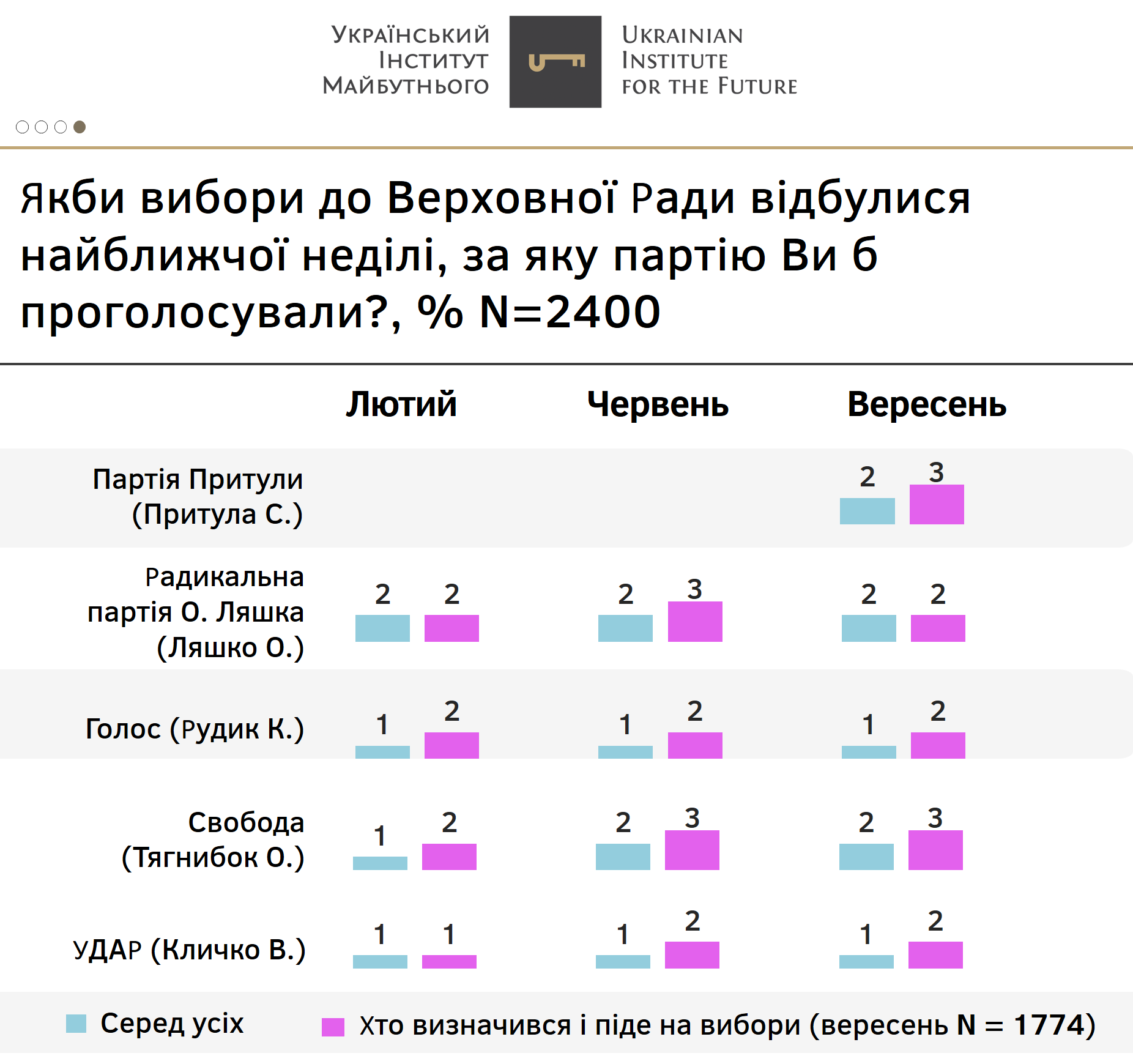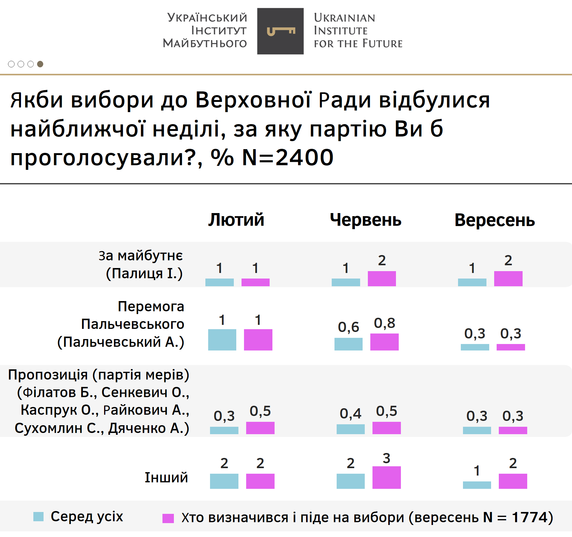 Український інститут майбутнього провів всеукраїнське соціологічне дослідження «Соціально-політичні настрої українців: вересень 2021» спільно з соціологічною компанією «Нью імідж маркетинг груп» серед 2 400 респондентів по всій території України у період з 18 по 28 вересня 2021 року, похибка складає не більше 2%.