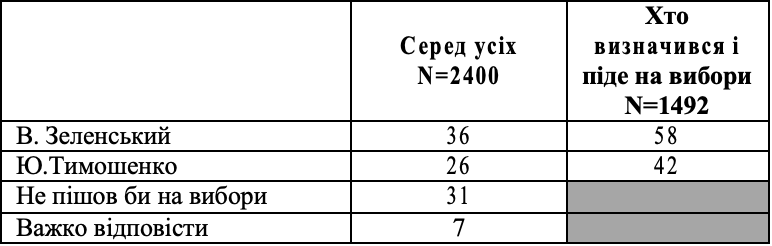 Якби В.Зеленський зустрівся у другому турі з Ю.Тимошенко, %