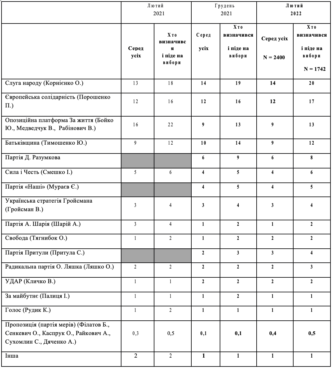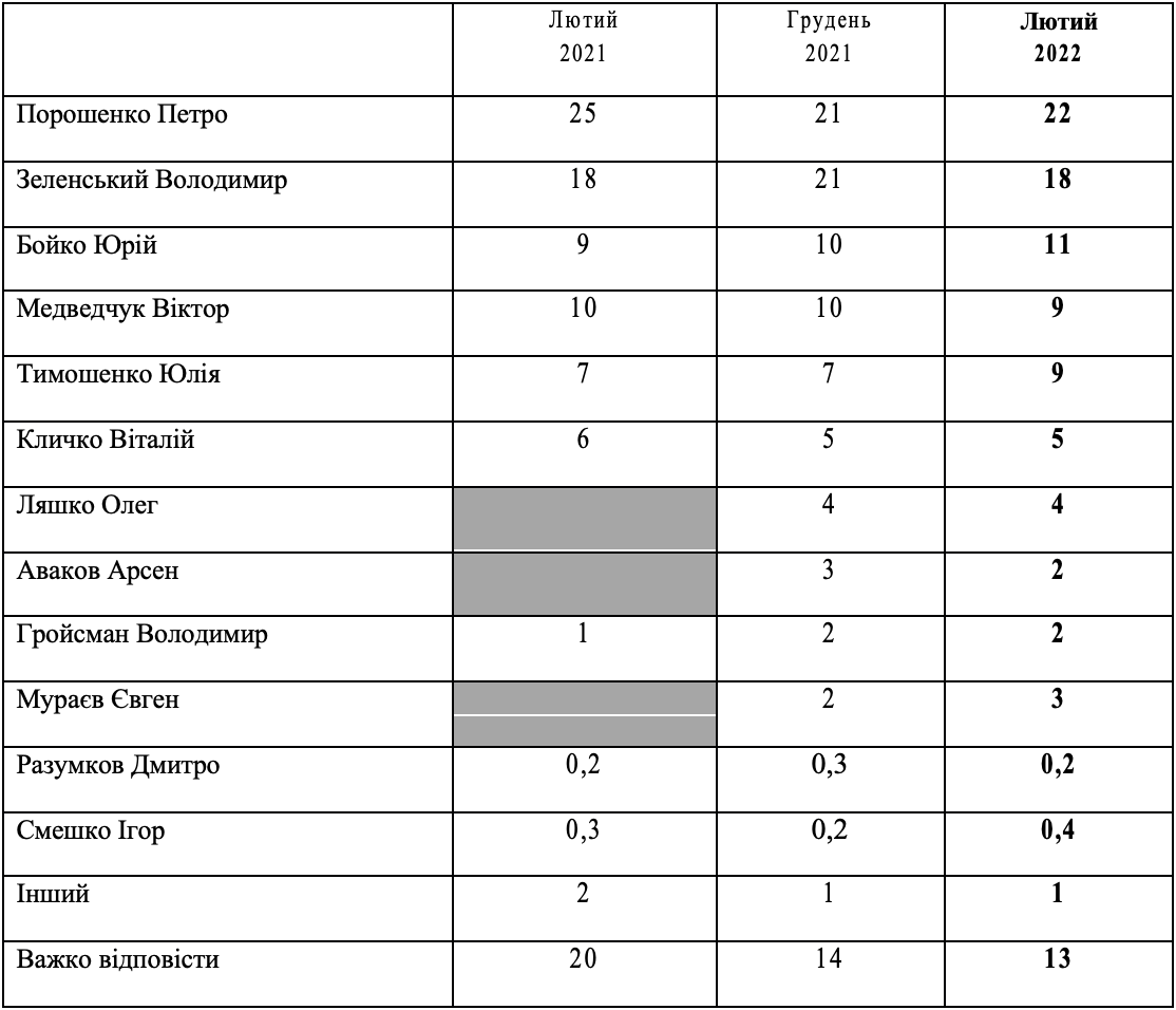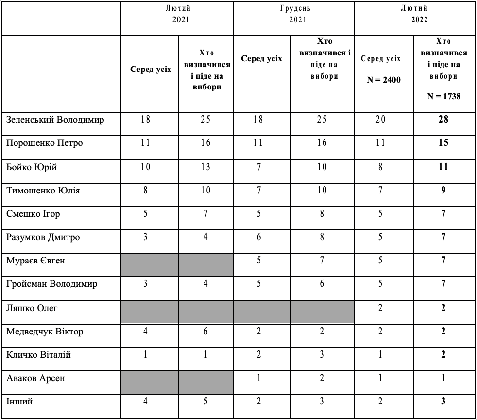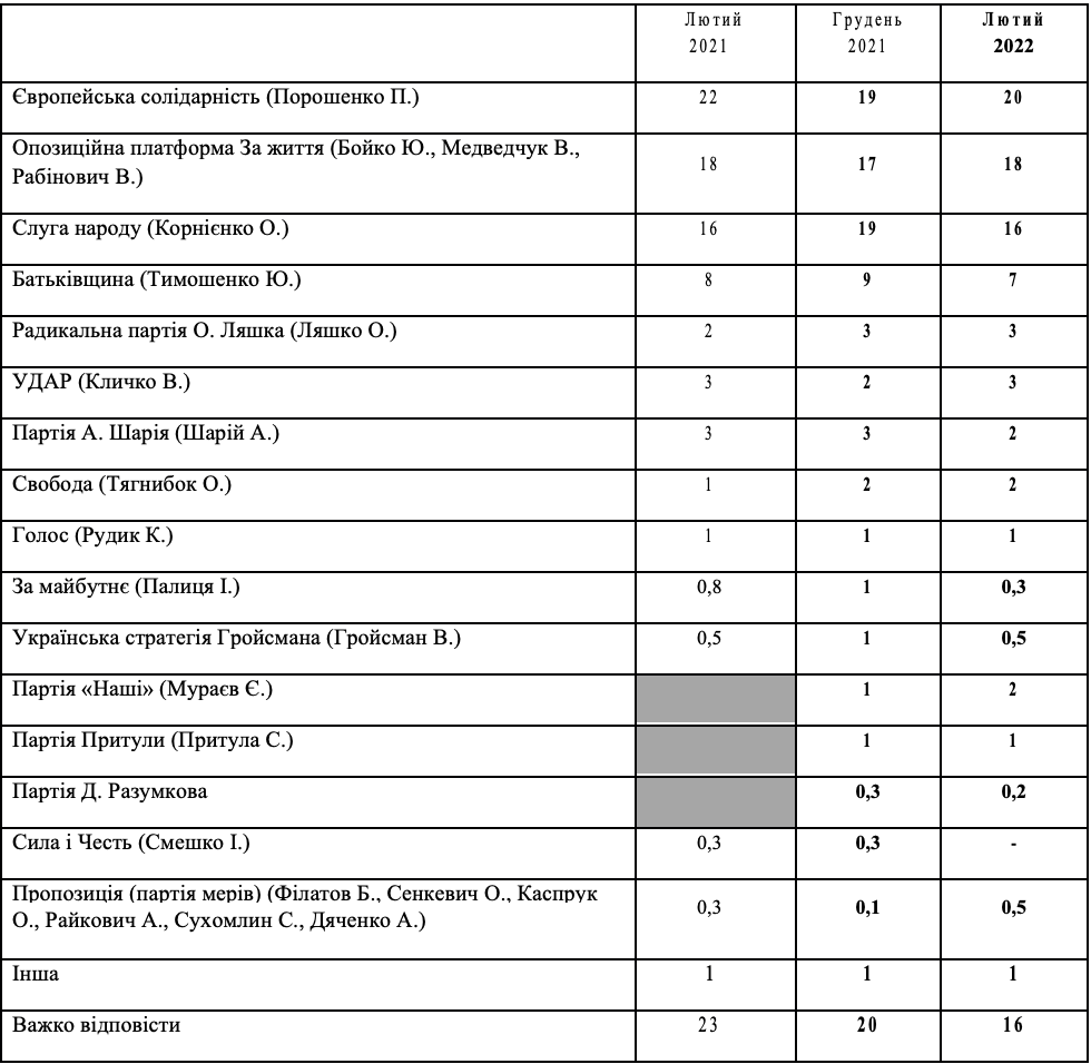 Український інститут майбутнього спільно з Нью імідж Мркетинг Груп презентують соціологічне дослідження щодо президентських та парламентських рейтингів серед населення України станом на лютий 2022 року. Дослідження було проведене серед 2400 респондентів у період з 8 лютого по 18 лютого 2022 року.