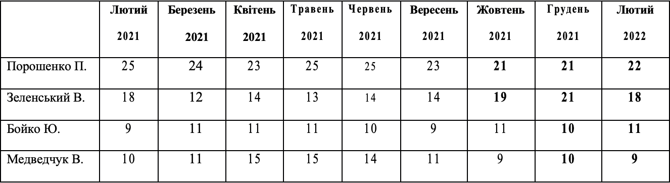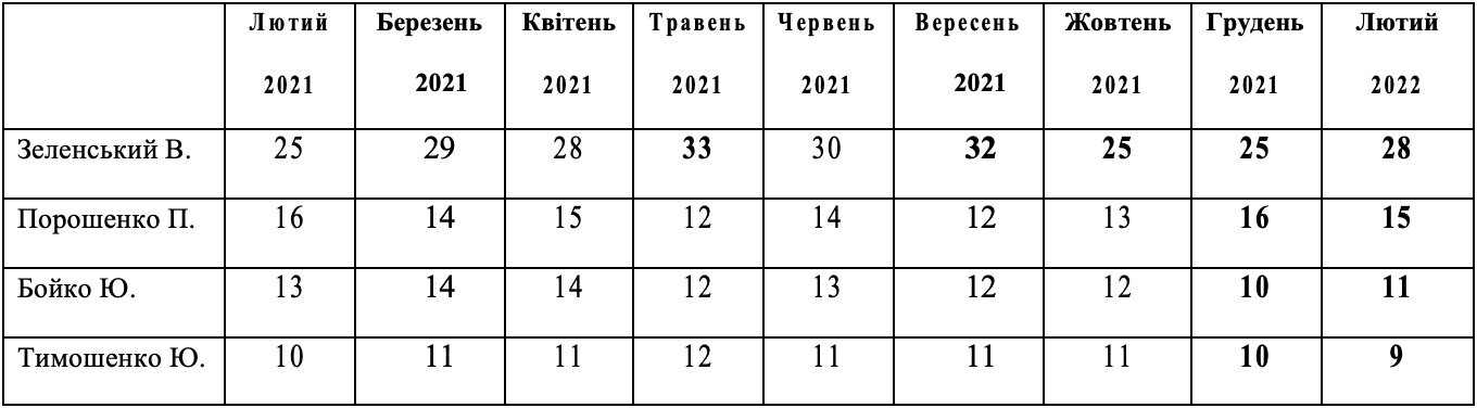 Динаміка рейтингів серед активного електорату основних кандидатів на президентську посаду у 2021-2022 роках, %