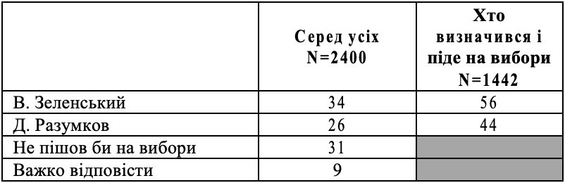 Якби Д.Разумков зустрівся у другому турі з В.Зеленським, %