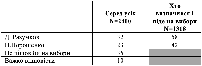 Якби Д.Разумков зустрівся у другому турі з П.Порошенко, %