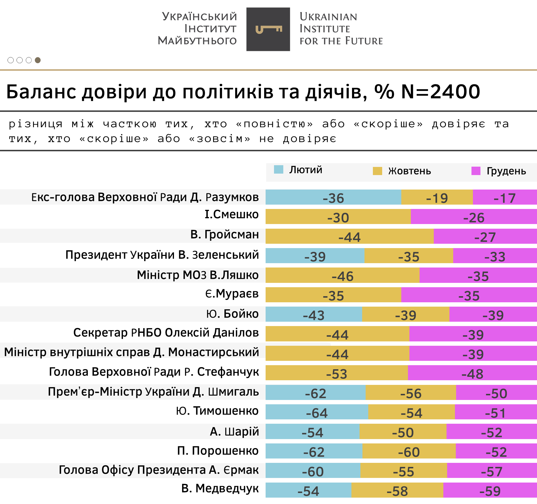 - Чинного президента за балансом довіри випереджає також Ігор Смешко з -26% та Володимир Гройсман (-27%).