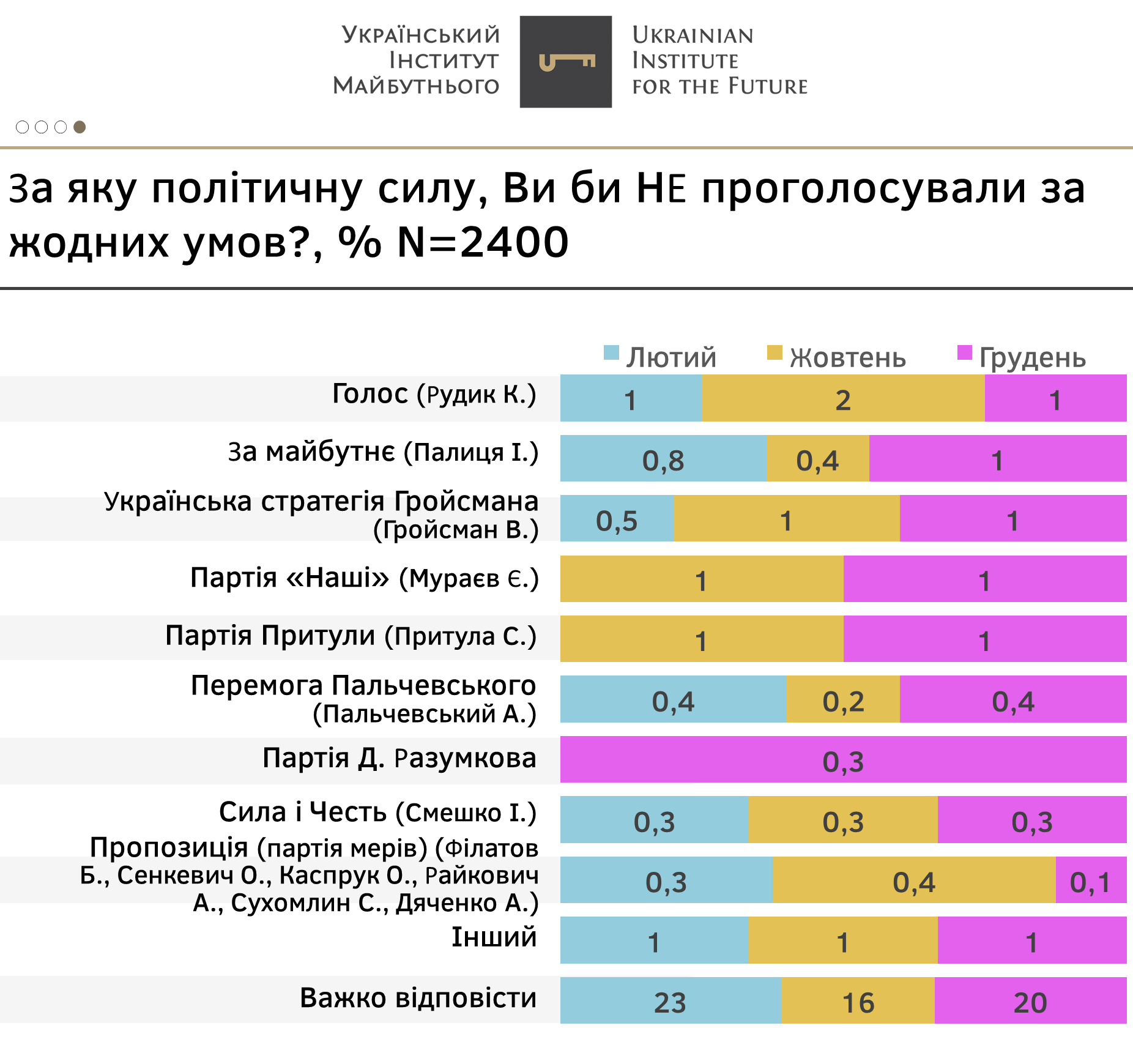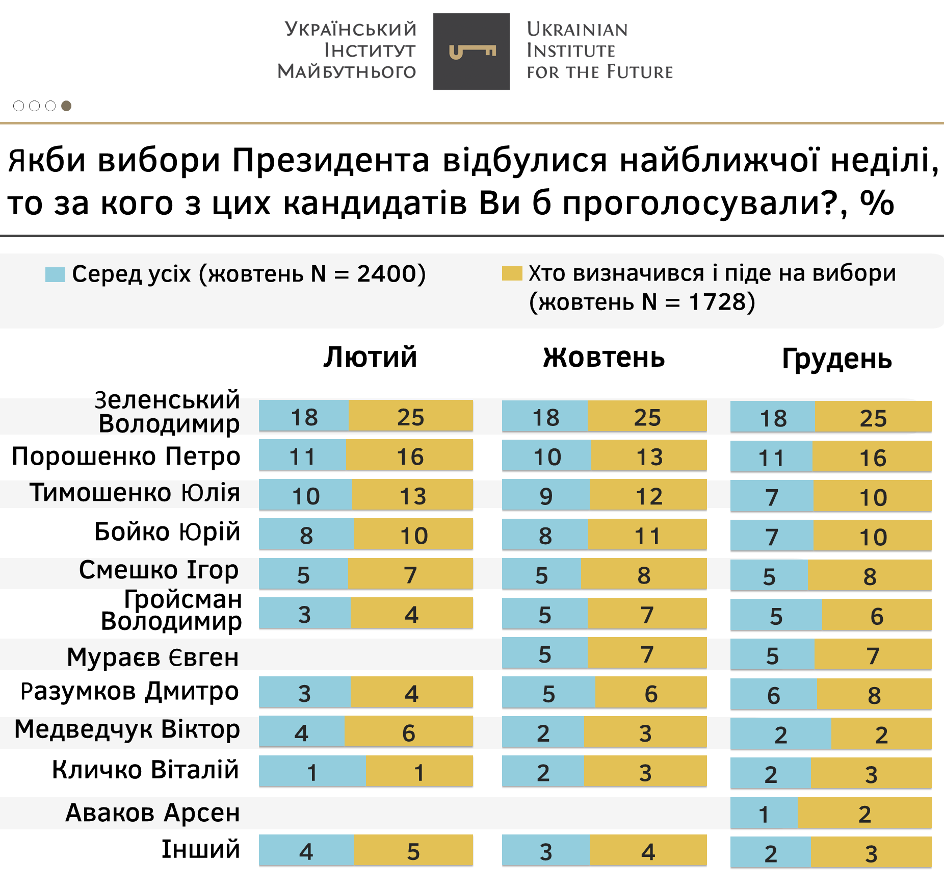 - До вже усталених кандидатів, які долають 5-відсотковий бар’єр у разі президентських виборів, Ігоря Смешко (8% серед тих, хто визначився і піде на вибори), Є.Мураєва (7%), В.Гройсмана (6%), наприкінці року доєднався екс-спікер ВР – Д.Разумков (8% серед тих, хто визначився і піде не вибори), який після початку самостійної політичної діяльності демонструє поступове зростання рейтингу та рівня впізнаваності і довіри.