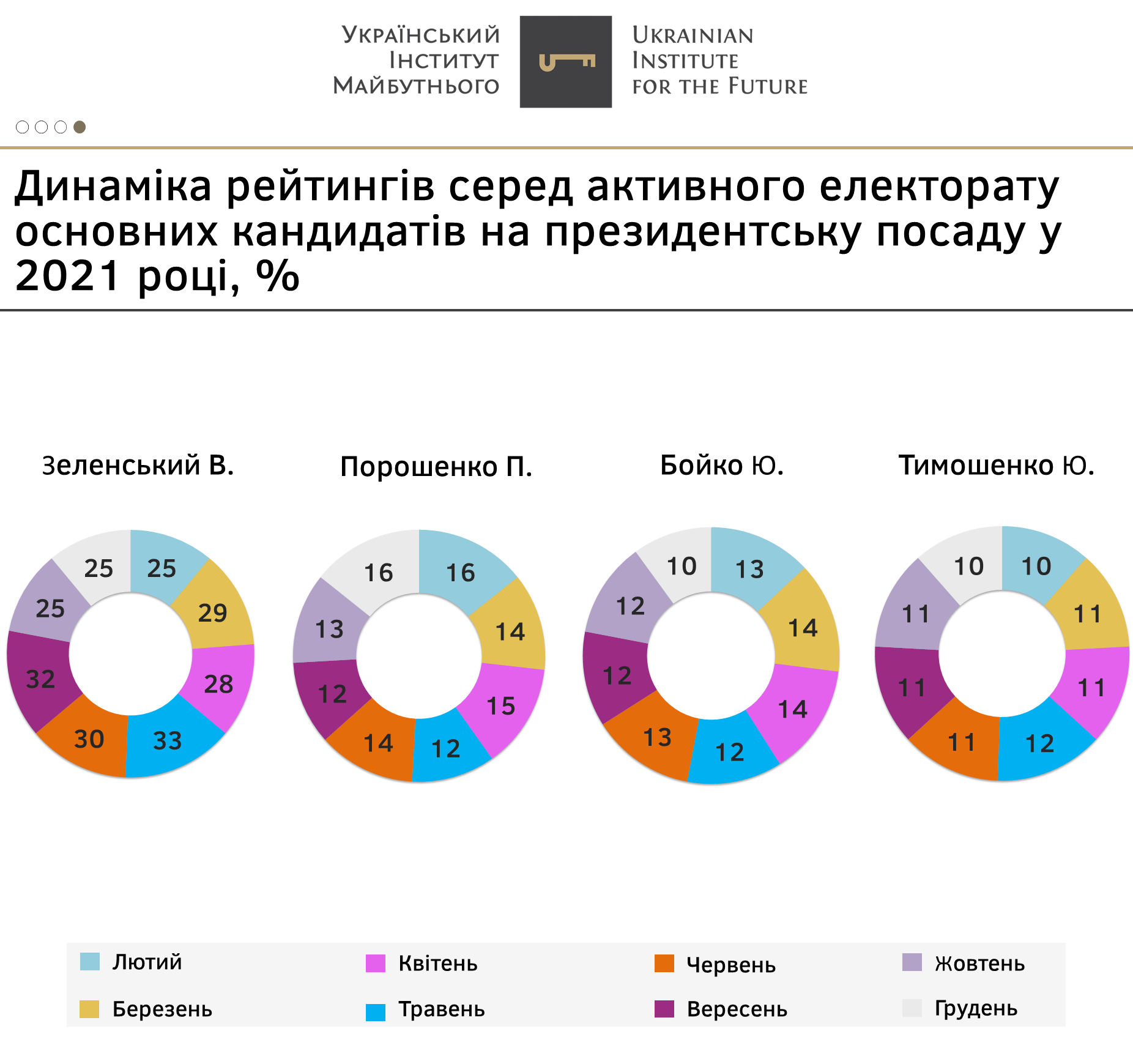 - Впродовж всього року В. Зеленський демонстрував стабільне зростання рейтингу, з найвищими показниками у травні (33%) та вересні (32%). Однак з жовтня почалося порушення тенденції щодо стабілізації рейтингу чинного президента на рівні 30-32% серед тих, хто піде голосувати та визначився. У жовтні, вперше за рік, показник В.Зеленського повернувся до лютневої позначки і він фактично закінчує рік з тим, з чим його і починав.