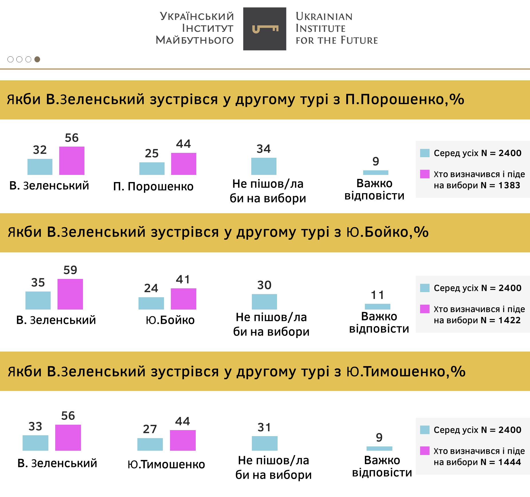 - За умови проведення другого туру, Володимир Зеленський виграє у всіх своїх найближчих переслідувачів майже з ідентичними показниками: 32% до 25% проти П. Порошенко (56% до 44% серед тих, хто піде та визначився), 35% до 24% проти Ю. Бойко (відповідно 59% до 41%) та 33% до 27% проти Ю. Тимошенко (відповідно 56% до 44%).