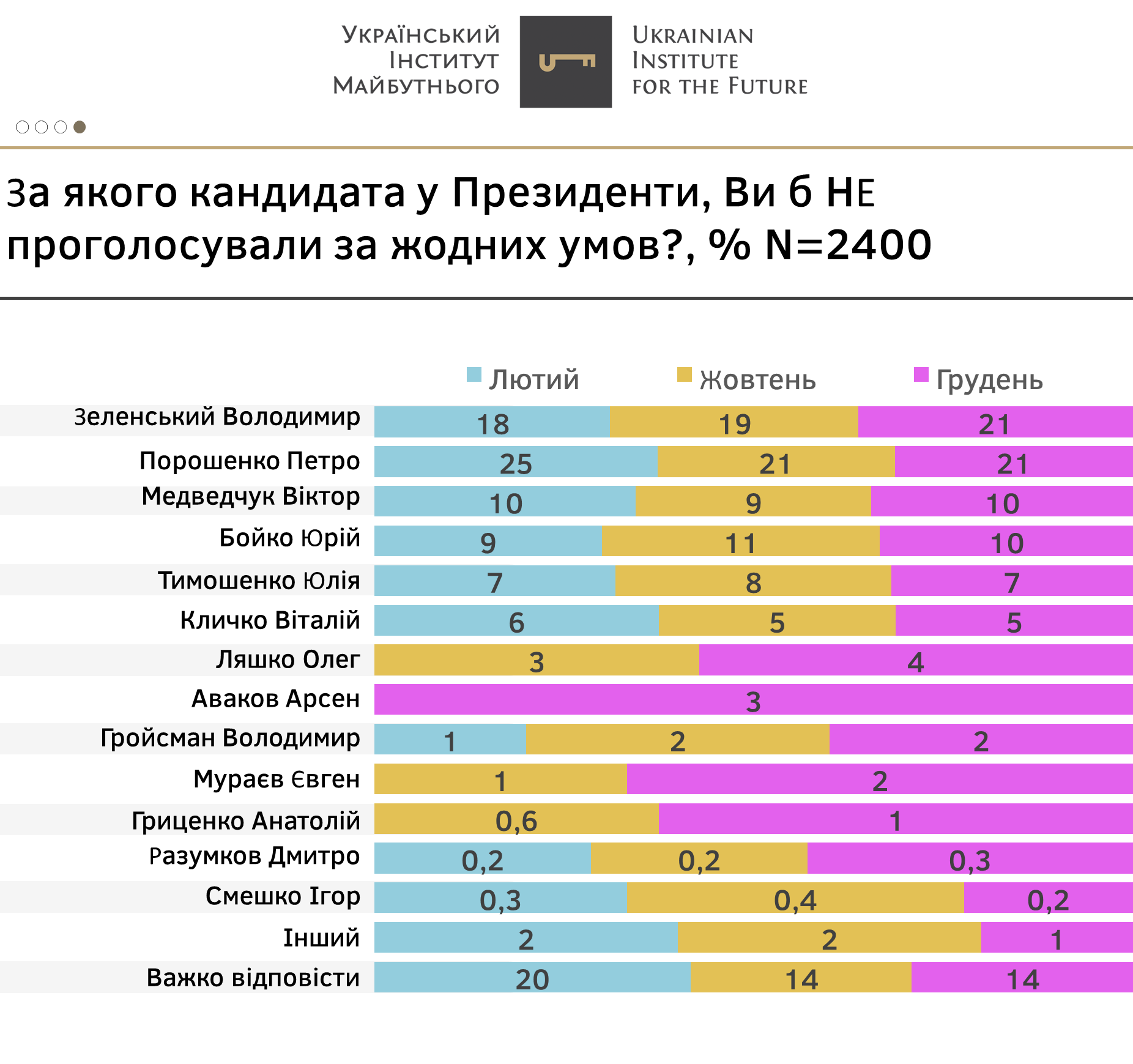 - Наприкінці року, хоч В.Зеленський і виграє в умовному другому турі у цих опонентів, в середньому розрив між ними скоротився на шість пунктів.