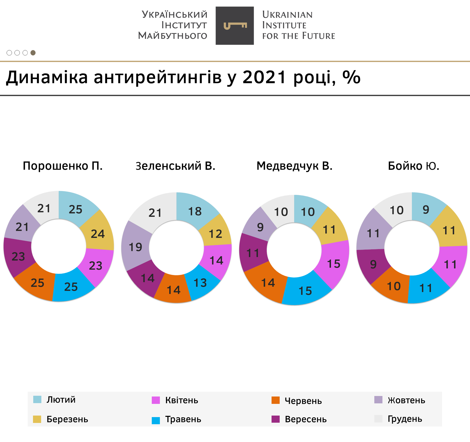 - Наприкінці року найвищий антирейтинг між собою ділять П. Порошенко (21%), який очолював його весь 2021 рік та В. Зеленський (21%), який доєднався до нього в грудні.