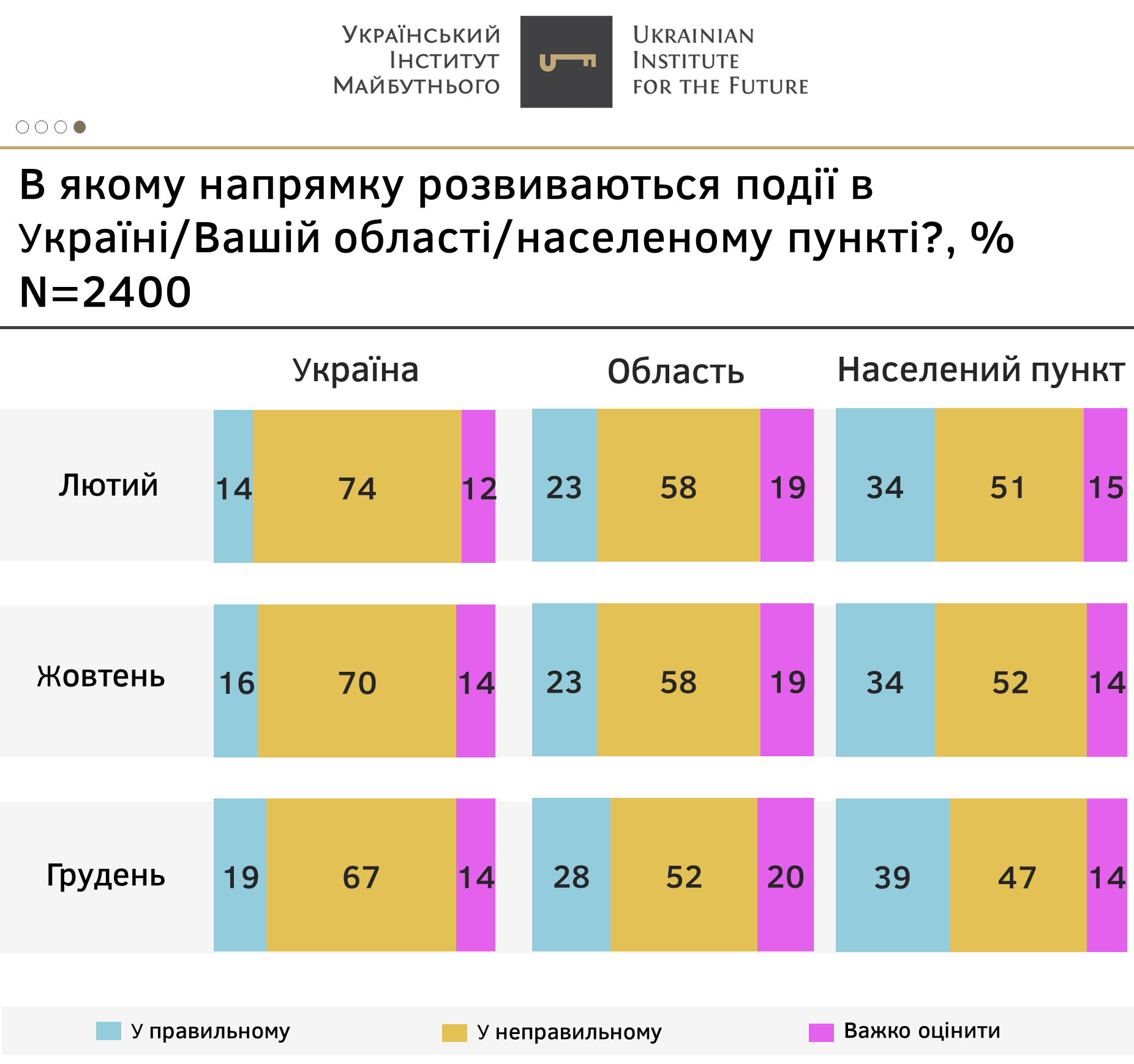 - Співвідношення оцінок щодо напрямку розвитку подій у їхньому населеному пункті в грудні складає 47% негативних та 39% позитивних і повернулися до показників лютого.