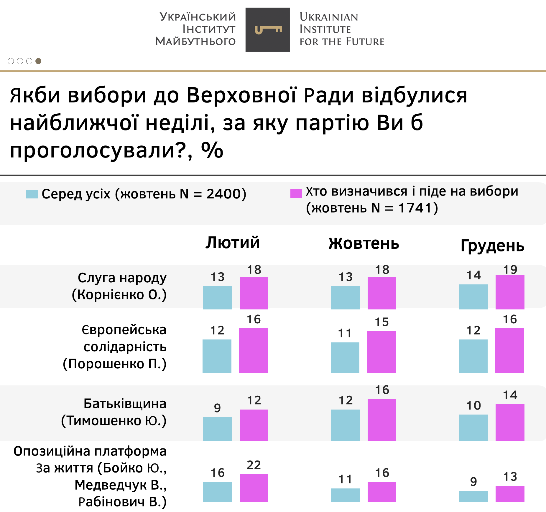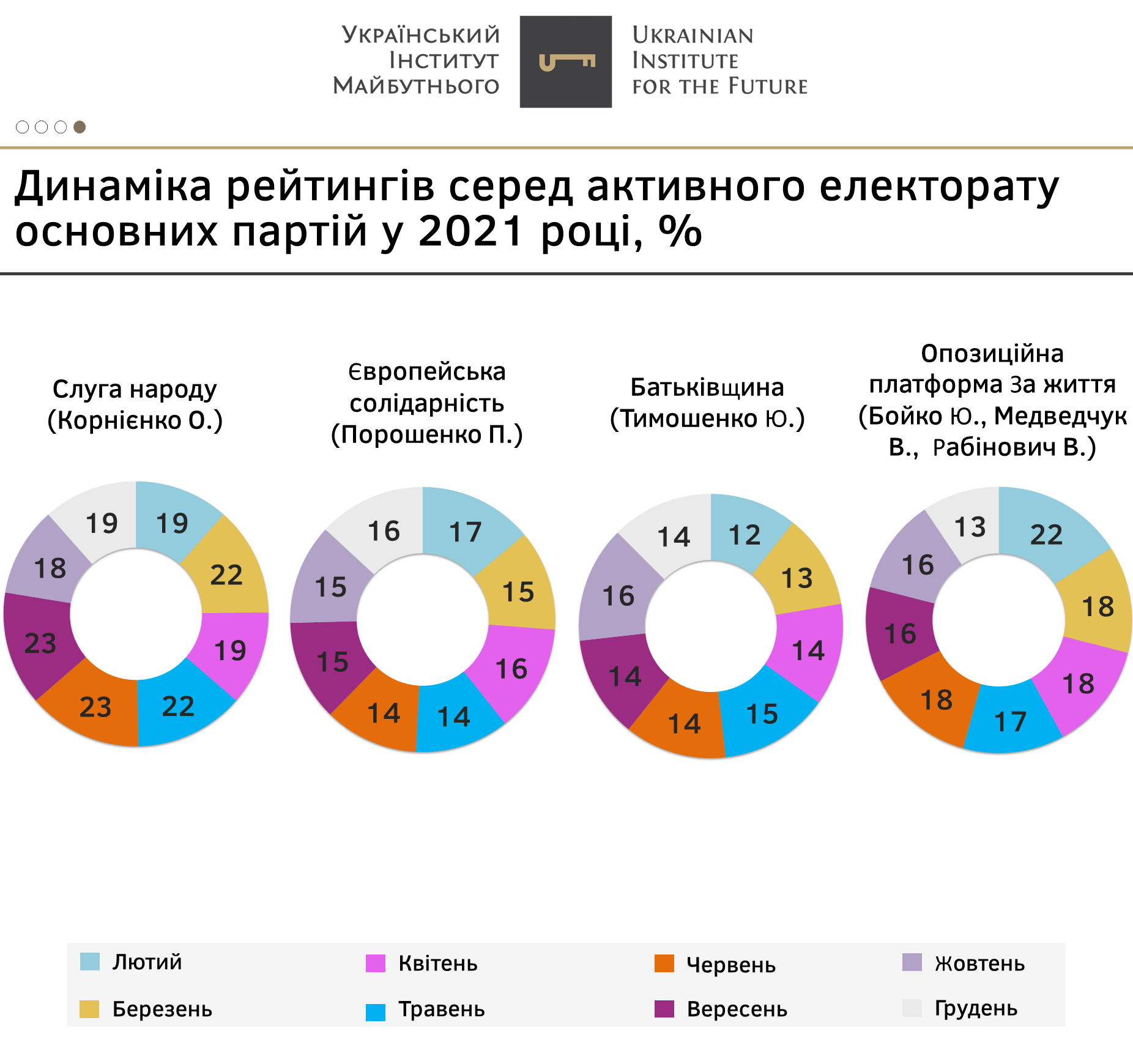 - Натомість партія «Опозиційна платформа за життя», яка на початку року очолювала партійні рейтинги, помітно втратила підтримку з лютого місяця – з 22% до 13% у грудні.