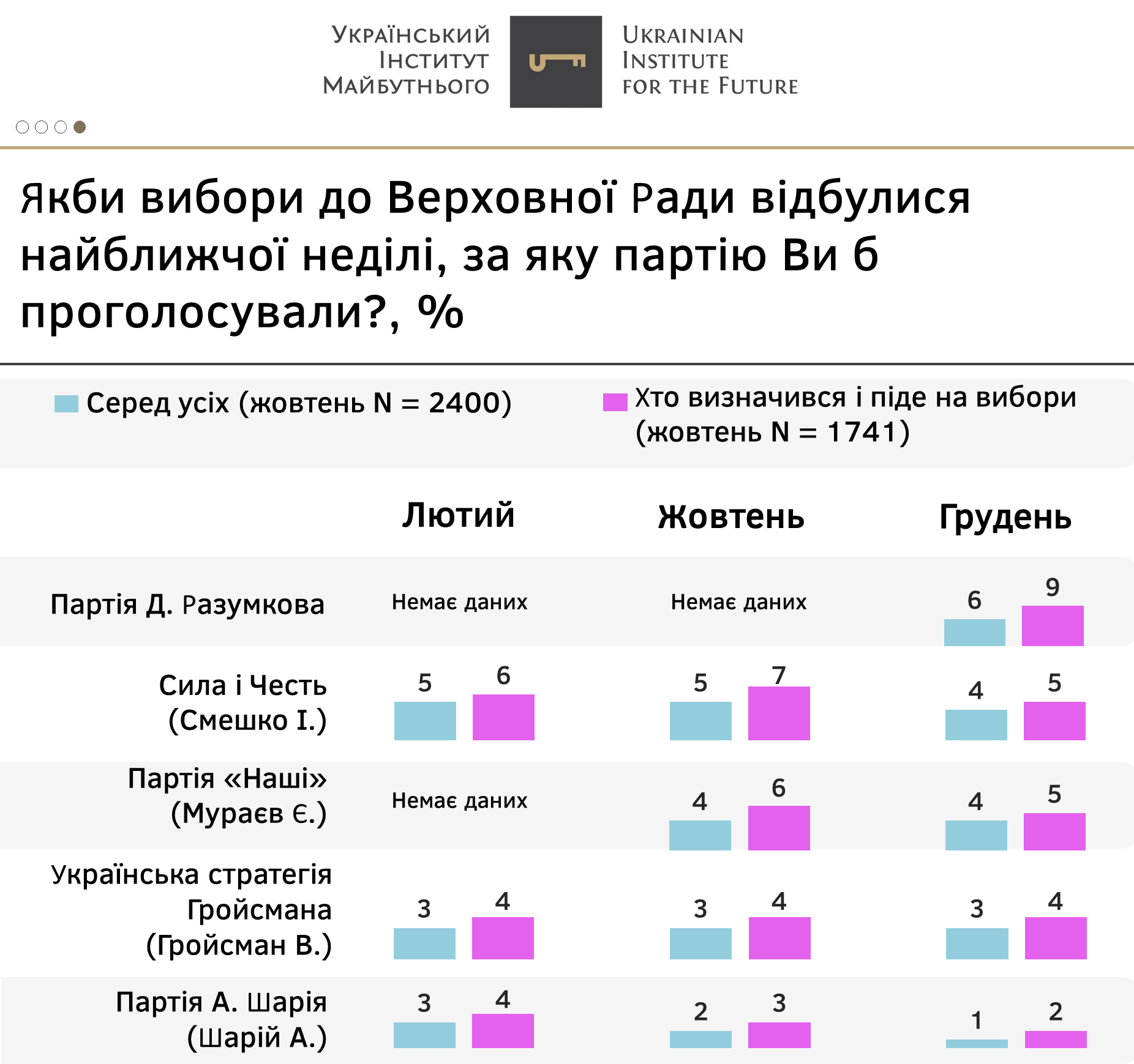 - Наприкінці року п’ятивідсотковий бар’єр в абсолютних показниках долає також партія Д.Разумкова, яка поки не представлена виборцям, однак вже отримала б 6% серед усіх опитаних та 9% серед активного електорату.
