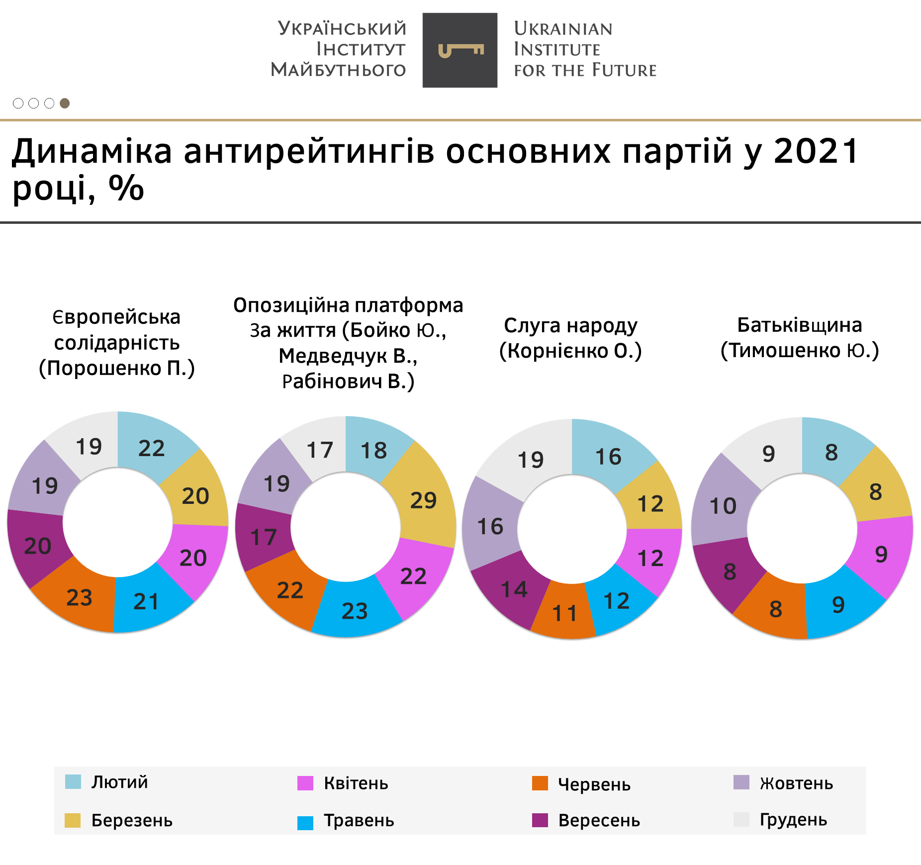 - Лідерами у антирейтингу партій наприкінці року є «Європейська солідарність» (19%) та «Слуга народу» (19%). Це корелює з особистими антирейтингами лідерів даних політичних сил.