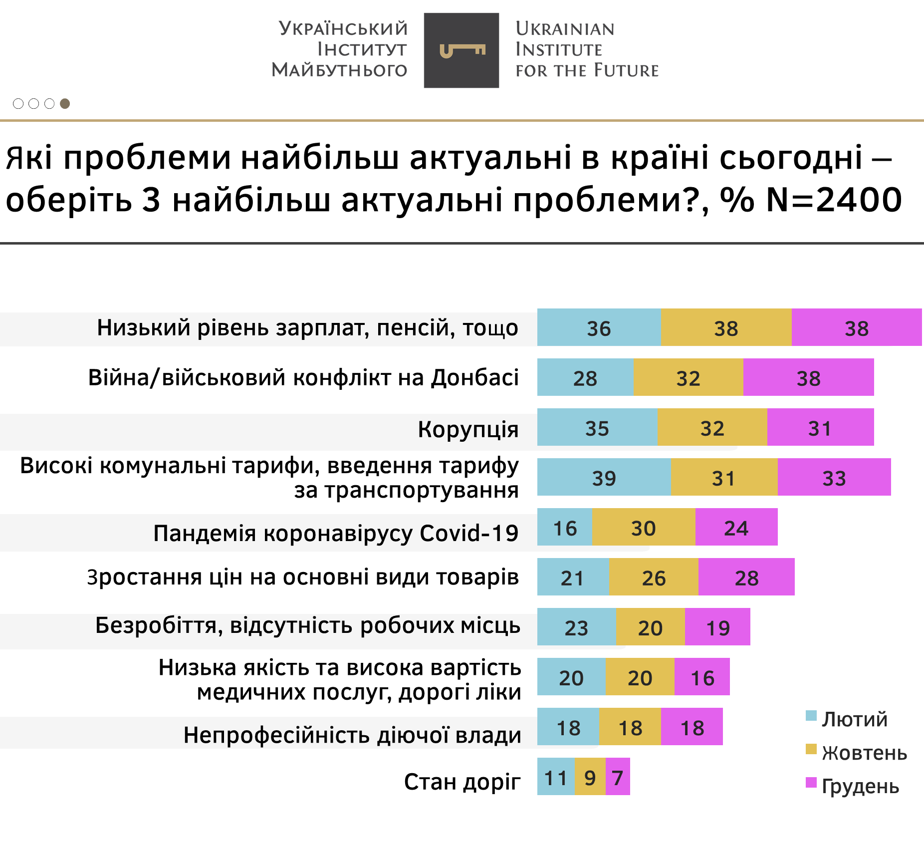 - Основними двома проблемами в Україні, порівняно з іншими, громадяни називають низькі зарплати, пенсії (38%), а також війну на Донбасі (38%), яка очікувано посіло перше місце в грудні з огляду на тривожні повідомлення з російсько-українського кордону.