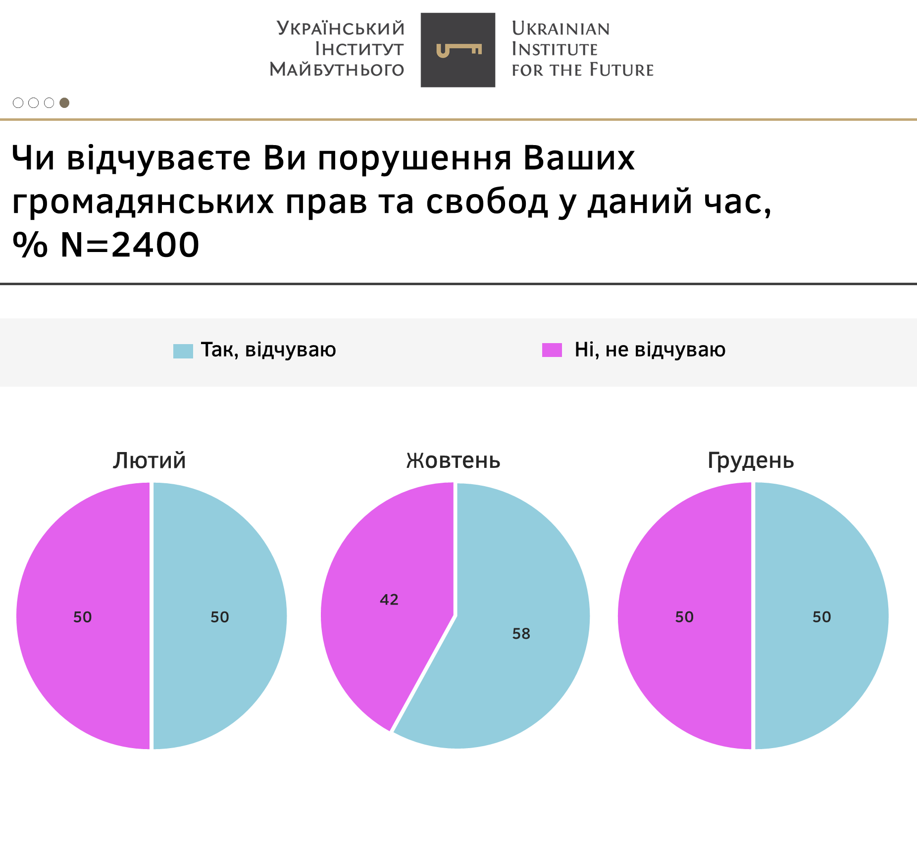 Половина громадян (50%) відчувають порушення їхніх прав та свобод, протилежної думки – теж 50%. Після того, як у жовтні, вперше за поточний рік кількість тих, хто відчуває порушення їхніх прав, перевищувала кількість тих, хто цього не відчуває, в кінці року настрої громадян фактично повернулися до показників лютого місяця.