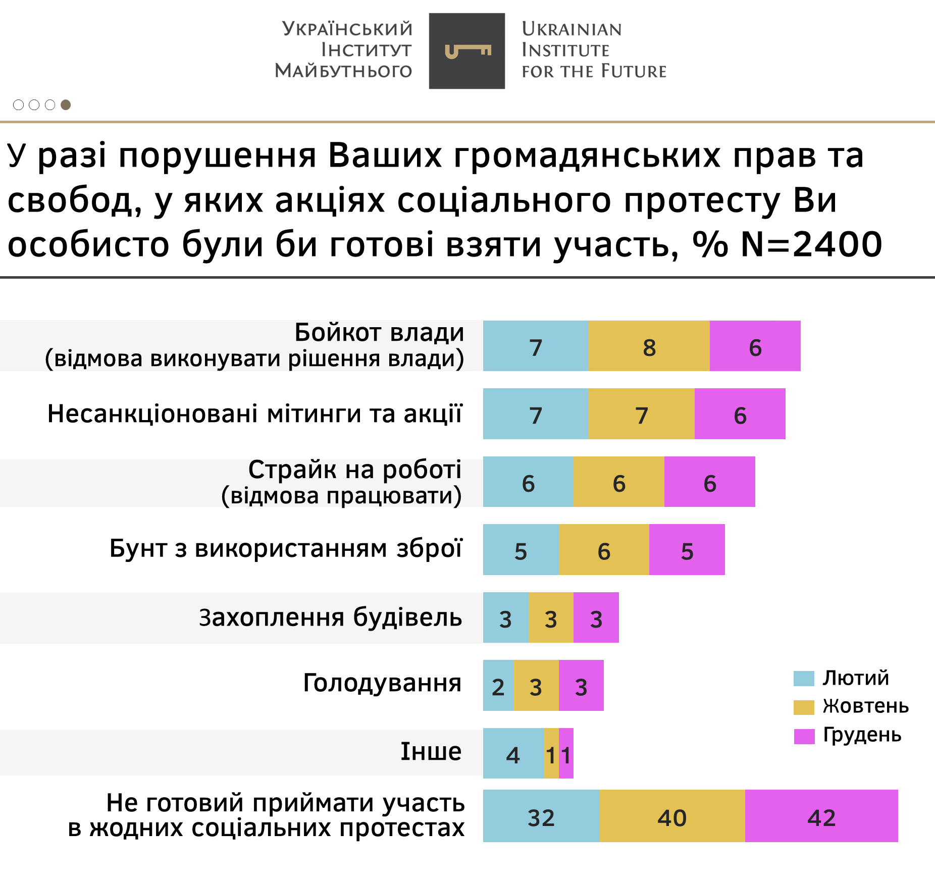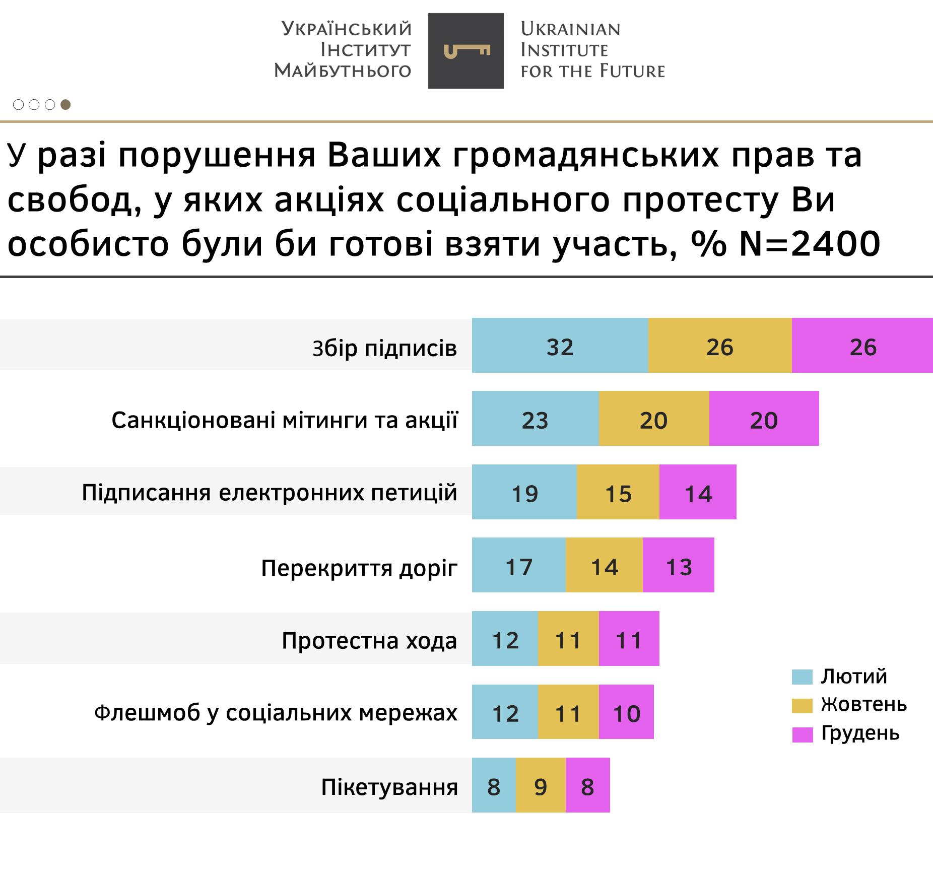 - В разі порушення їхніх прав громадяни обирають переважно мирні та ненасильницькі методи для захисту своїх прав та свобод. Це підтверджують результати всіх досліджень за поточний рік. У першу чергу це збір підписів (26%), санкціоновані мітинги і акції (20%), електронні петиції (14%). Єдиним, серед найбільш популярних, заходом, який виходить за межі санкціонованих – є перекриття доріг (13%). Загалом же радикальні акції набирають не більше 5-6% і суттєво відстають від поміркованих заходів.