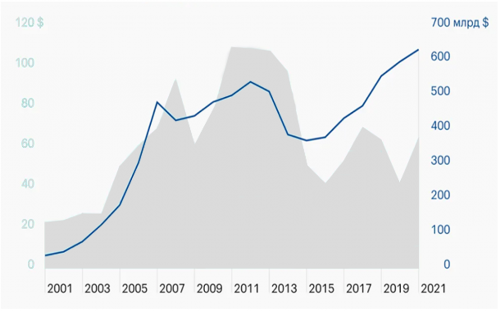 Рисунок 1. Динаміка цін на нафту та золотовалютні резерви РФ у 2001-2021 рр.