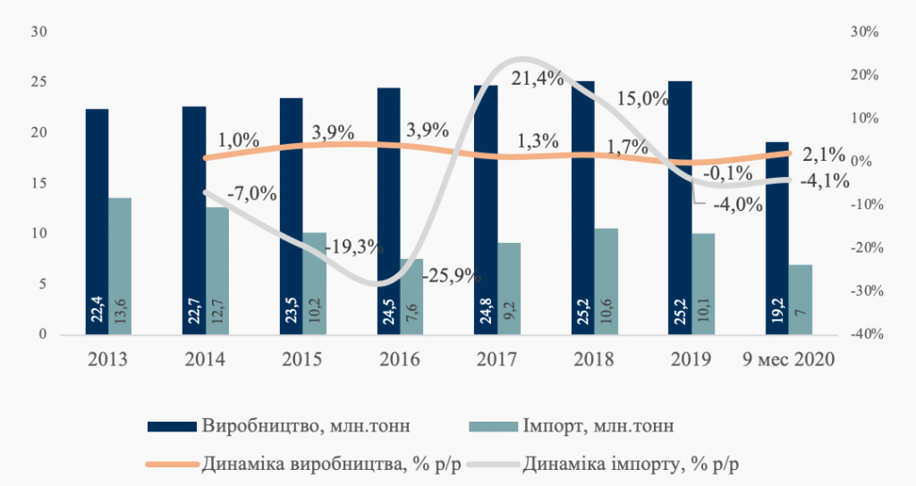 Рисунок 3. Динаміка виробництва та імпорту підсанкційної харчової продукції до РФ у 2013-2020 рр.