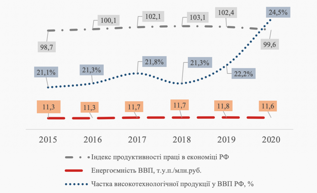 Про провали у економічній політиці свідчить і динаміка показників ефективності економіки РФ у період 2015-2020 рр., таких як: індекс продуктивності праці, енергоємність ВВП, частка високотехнологічної продукції у ВВП. За шість років жоден з цих показників не продемонстрував суттєвої позитивної динаміки (див.рис.6). Це при тому, що в одному з указів Президента РФ було поставлено завдання знизити енергоємність ВВП країни у період 2007-2020 рр. на 40%, однак фактичне зниження склало усього лише 5%[38]. Ефективність праці РФ приблизно втричі нижча ніж у США, з відсутністю перспектив до суттєвих змін. У 2017 р. Прем’єр-міністр Росії Д.Медведєв зазначав: «що росіяни працюють більше, ніж у країнах OECD, «а результати дуже середні», називаючи серед причин такого стану справ: відсутність стимулів до розвитку через недостатню конкуренцію, технологічне відставання, відсутність управлінських компетенцій у керівників компаній та органів влади, брак інвестицій та недосконалість законодавства»[39]. Не велике зростання частки високотехнологічної продукції у ВВП можна пояснити переважно державними замовленнями у сфері ОПК на тлі погіршення загальних виробничих показників у країні.