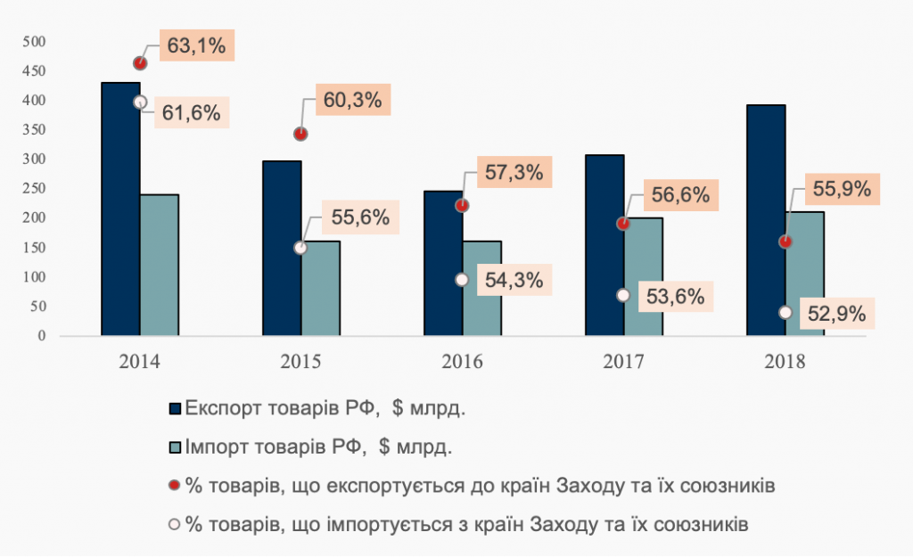 - у період 2014-2018 рр. частка експорту РФ до країн заходу та їх союзників поступово почала знижуватися (з 63,1% до 55,9%), навіть після відновлення рівня цін на нафту з 2016 р., що пояснюється певною переорієнтацією сировинних поставок РФ на ринки країн Південно-Східної Азії. Частка імпорту з боку розвинених країн також продовжувала зменшуватися (скоротившись майже на 10% у період 2014-2018 рр.). Враховуючи показники ефективності економіки РФ – це свідчить, скоріше, про нарощення її технологічного відставання, ніж про розширення економічної незалежності від західного світу;