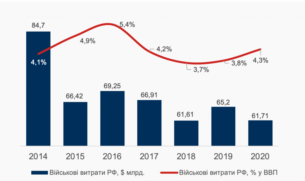Відповідно з 2011 р. відновлюється і нарощення асигнувань федерального бюджету РФ на національну оборону. Так, за даними Світового банку, якщо у 2010 р. витрати були на рівні $58,7 млрд. (що перевищувало показник попереднього року усього на 7,4%), то у 2011 р., 2012 р., 2013 р., таке зростання склало 20%, 15,7%, 8,4% відповідно[3]. Поки що ці данні вказають, скоріше, не на підготовку РФ до початку агресії в Україні у 2014 р., а на зв’язок між цінами на нафту та можливостями лідерів РФ фінансувати з федерального бюджету імперський поступ.
