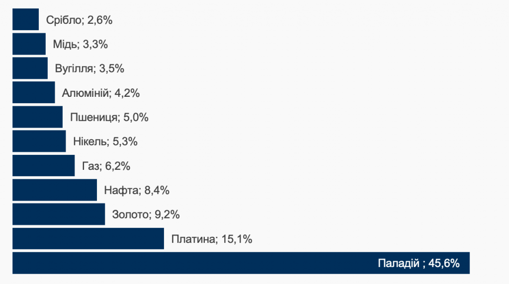 Таблиця 11. Частка РФ у світовій пропозиції сировинних товарів, %