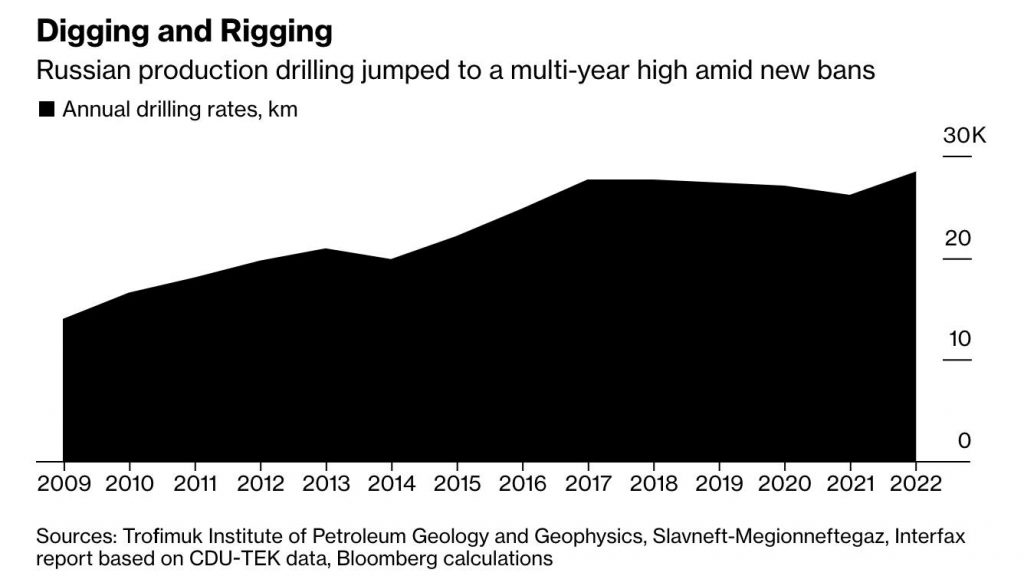 За результатами 2022 року російські нафтові компанії поставили рекорд у бурінні нових нафтових свердловин за минулі 10 років: пробурено 28 тис. км, а кількість запущених свердловин зросла на 7%, перевищивши 7 800.
