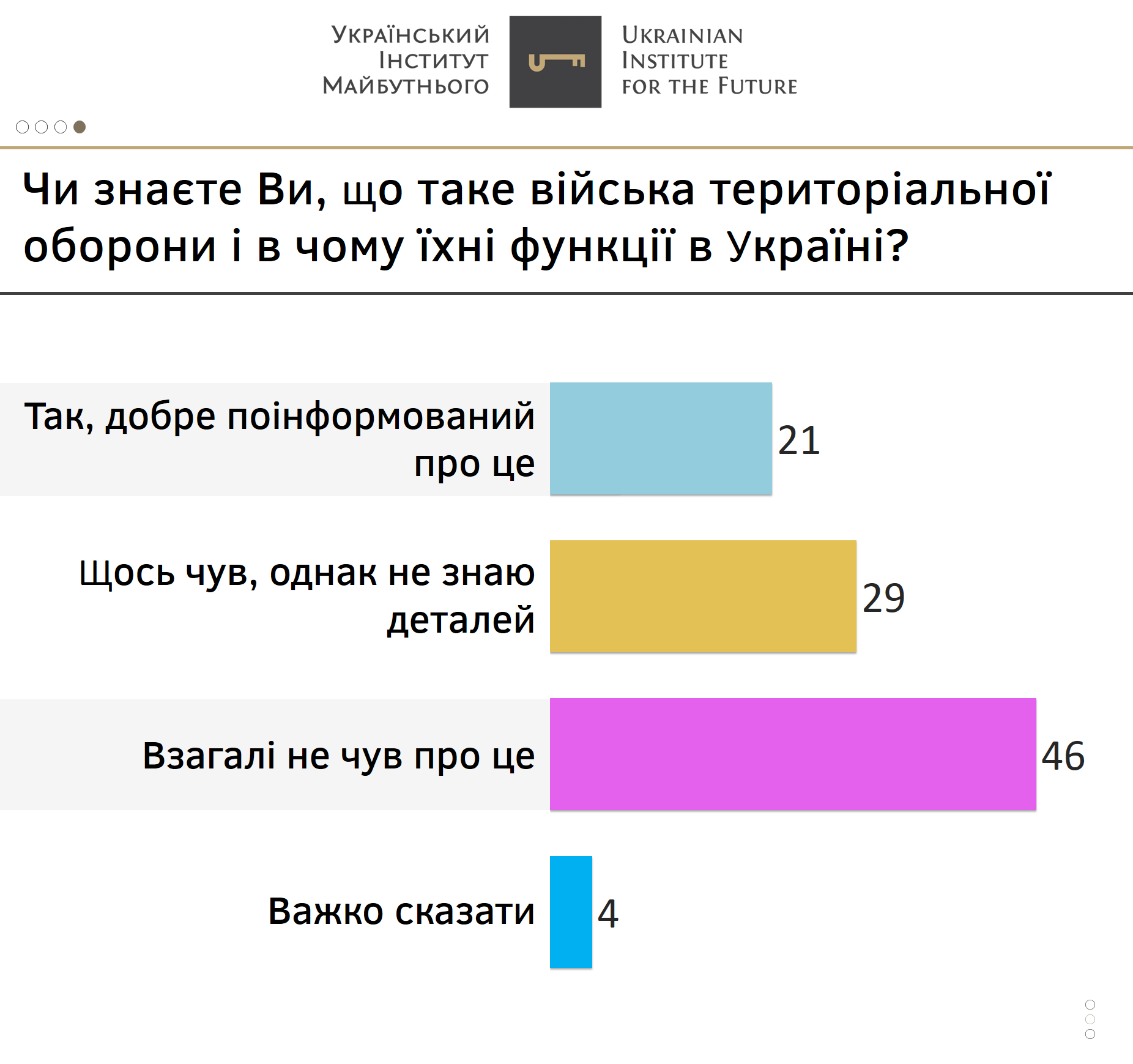 Близько половини громадян (46%) нічого не чули про війська територіальної оборони та які функції вони виконують. Натомість добре проінформовані про це 21% респондентів і ще 29% щось чули, але не знають подробиць.