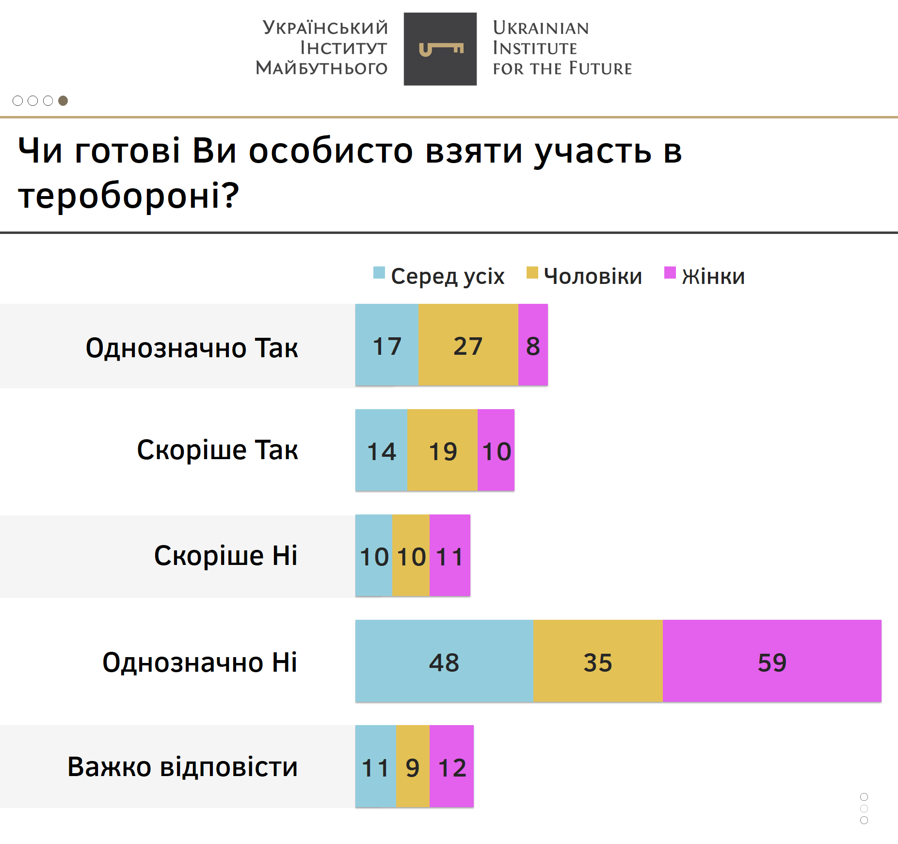 Важливо показати різницю у відповідях серед чоловіків та жінок: половина чоловіків (50%) підтримують цей крок і ще третина проти. Натомість серед жінок відповіді розділилися майже порівну: 34% виступають за створення військ територіальної оборони і 33% – проти.