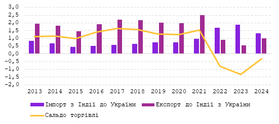 Обсяг експорту впав до рекордно низьких рівнів, у 2023 році експорт становив 0,5 млрд дол. США, а в 2024 – 1 млрд дол. США. Україна наразі ще далеко від довоєнних обсягів експорту до Індії. Імпорт з Індії до України, навпаки, зріс порівняно з довоєнними роками.