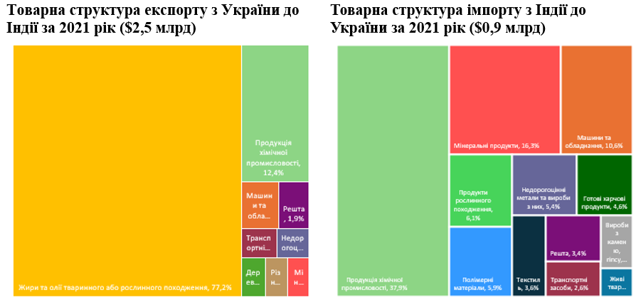 Якщо розглянути структуру експорту, то до повномасштабної війни Україна традиційно найбільше усього експортувала до Індії жири та олії (за 2021 рік частка в експорті товарів цієї групи товарів складала 77,2%). З Індії Україна імпортувала в основному фармацевтичну продукцію, мінерали та машинне обладнання. Тобто ми до Індії постачали здебільшого сировинні товари з низькою доданою вартістю, а імпортували товари з вищим ступенем переробки.