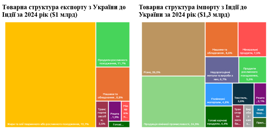 Жири та олії залишаються найбільшою статтею українського експорту товарів до Індії (за 2024 рік частка в експорті товарів складала 72,7%).