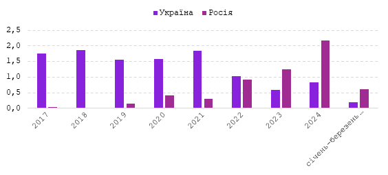 Після 2022 року ситуація кардинально змінилась. Обсяги імпорту з України скоротились, а з РФ продовжують зростати. В 2022 році Україна експортувала до Індія жирів та олій на 1 млрд дол. США, а в 2024 на 800 млн дол. США. З РФ обсяг імпорту жирів та олій зріс майже вдвічі. Індія в 2022 році з РФ імпортувала 900 млн дол. США, а в 2024 році – 2,2 млрд дол. США.