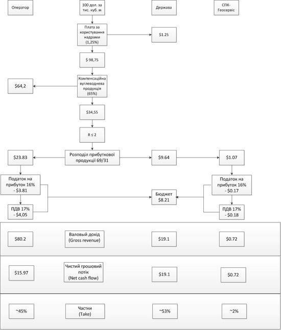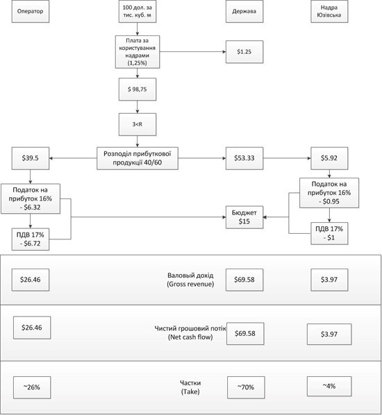 Якщо припустити, що умовна вартість тисячі кубів газу становить 100 доларів США, то розподіл цих коштів виглядатиме наступним чином – рисунок 2. Оскільки видобуток почнеться після 1 січня 2014 року, ставки ПДВ та податку на прибуток становлять 17% та 16%.