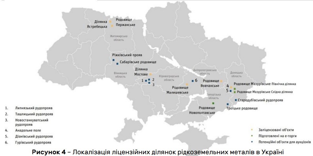 Наразі світовим монополістом є Китай, який поставляє рідкісноземельні елементи на світовий ринок та тривалий час демпінгував ціни, щоб конкуренти не розвивались. Зокрема й Україна. Коли, внаслідок торгівельної війни з США, Китай заявив, що перестане продавати рідкоземельні елементи, то всі країни, серед них і США, заопікувались тим, щоб мати власні ресурси. Саме через конкуренцію з Китаєм та прагнення незалежності від монополіста США активно шукає нові родовища рідкісноземельних металів. Окрім Китаю, поклади рідкісноземельних елементів є у Австралії, Росії, Бразилії, Гренландії, Канаді, В’єтнамі, нещодавно у Норвегії відкрили велике родовище (10% світових запасів). Локалізація українських ліцензійних площ рідкоземельних металів наведена на рисунку 4.