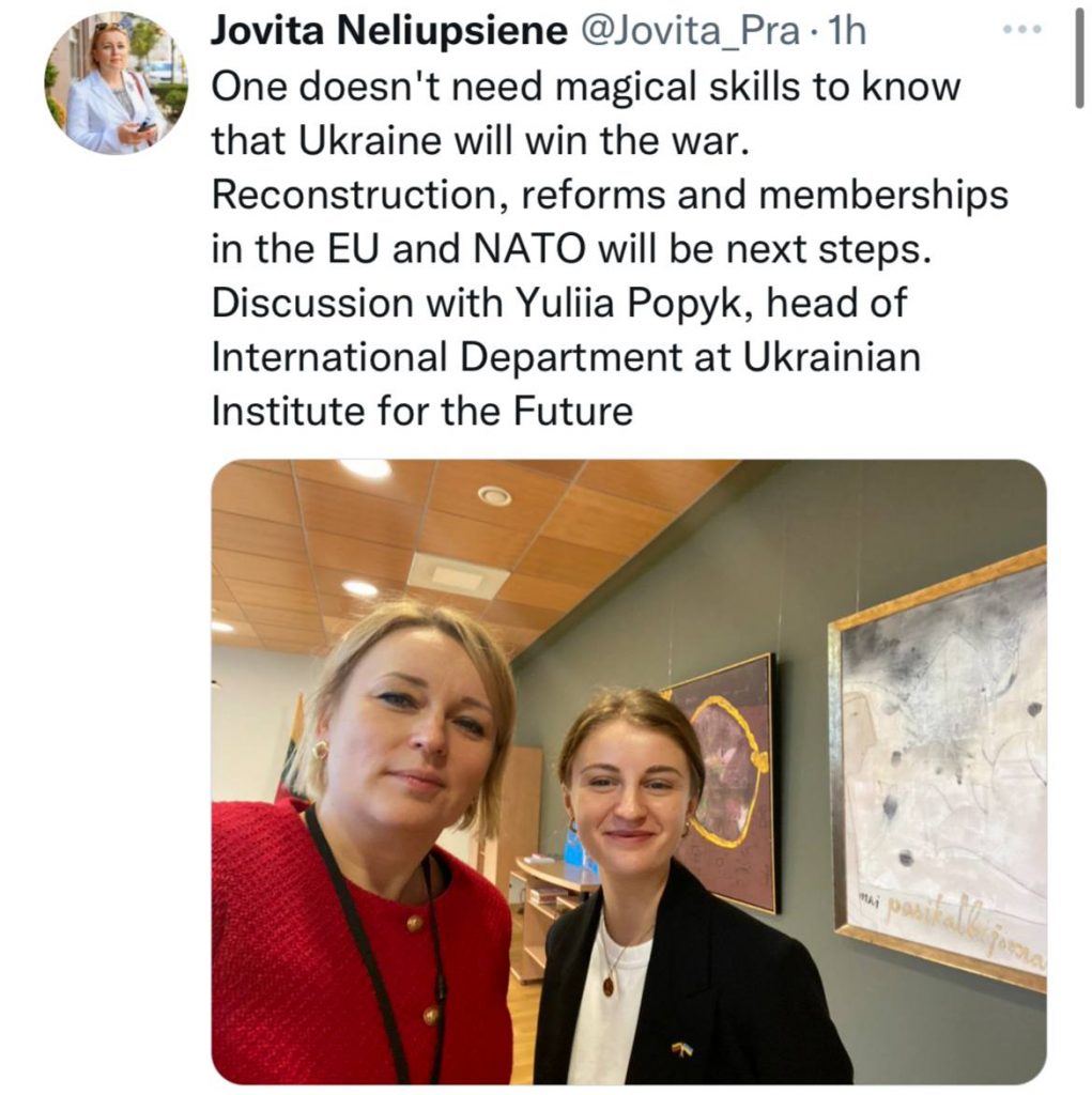 Цього тижня Julia Popyk, керівниця з питань міжнародного співробітництва та партнерства UIF відвідала Вільнюс, де зустрілася із заступницею Міністерки закодонних справ Литви Jovita Neliupšienė та з керівником литовського аналітичного центру EESC Linas Kojala.
