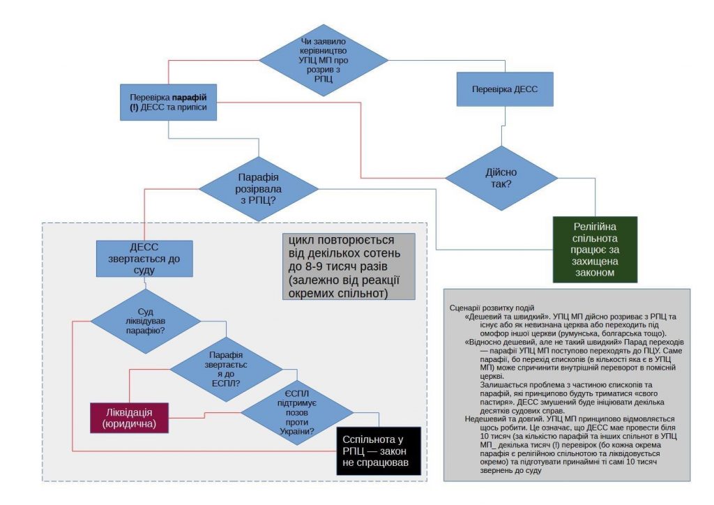 У разі негативного розвитку подій ДЕСС потребуватиме значного збільшення штату — принаймні 500 юристів, щоб справлятися з обсягом роботи. Це дозволить подавати до суду до 3 тисяч справ щомісяця, з розглядом кожної справи, включаючи можливі оскарження, від 2 до 6 місяців. Деякі парафії можуть звернутися до Європейського суду з прав людини, що вимагатиме від України захисту справедливості свого рішення. Отже, втілення закону може зайняти від року в оптимістичному сценарії до 3-4 років у менш сприятливому.
