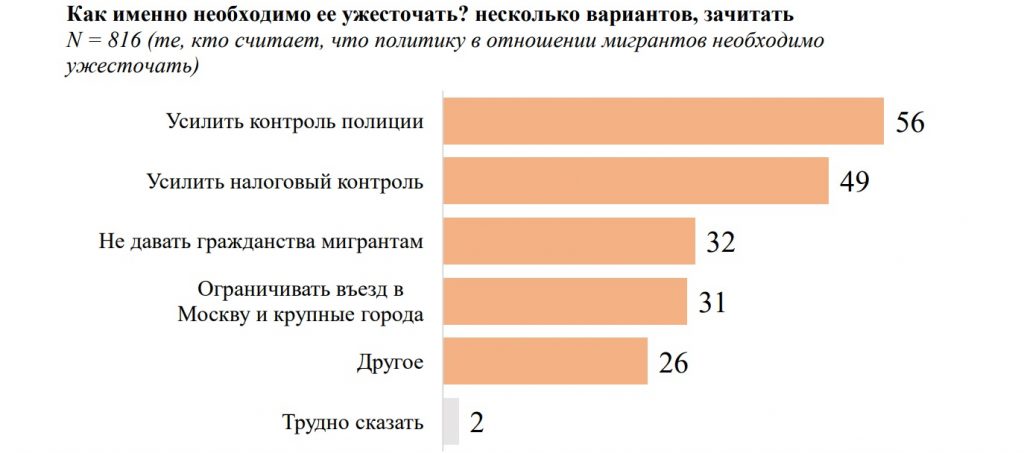 Другие варианты: полностью запретить въезд / ввести квоты на въезд / сделать визовый въезд; ограничить количество мигрантов; ограничить время пребывания в стране / в крупных городах; усилить контроль на границе / тщательнее проверять при въезде; строгий паспортный контроль, биометрия / контролировать местонахождение, регистрацию; депортировать за нарушения законов и порядка; усложнить процедуру получения гражданства; требовать знания русского языка, традиций и конституции рф / ввести экзамен для получения вида на жительство / гражданства; мобилизовывать в СВО для получения гражданства; заставлять работать; осуществлять медицинский контроль
