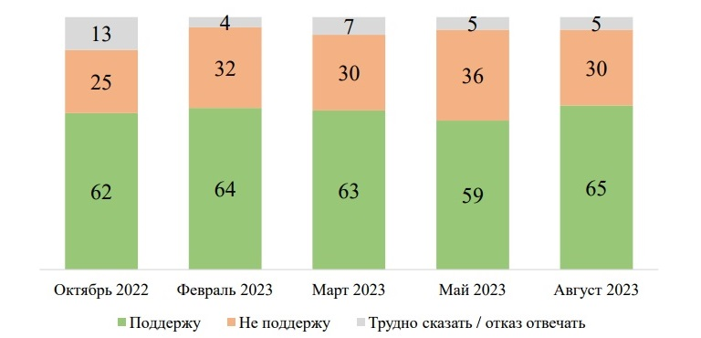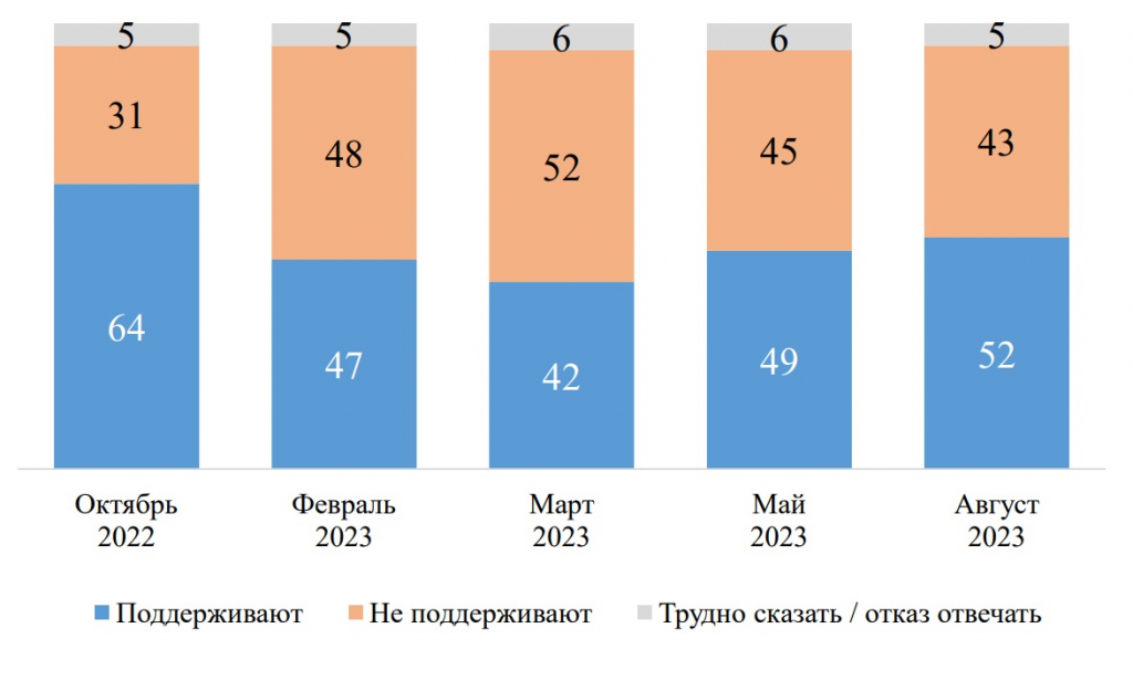 Динамика поддержки мобилизации с октября 2022 по май 2023 (%)