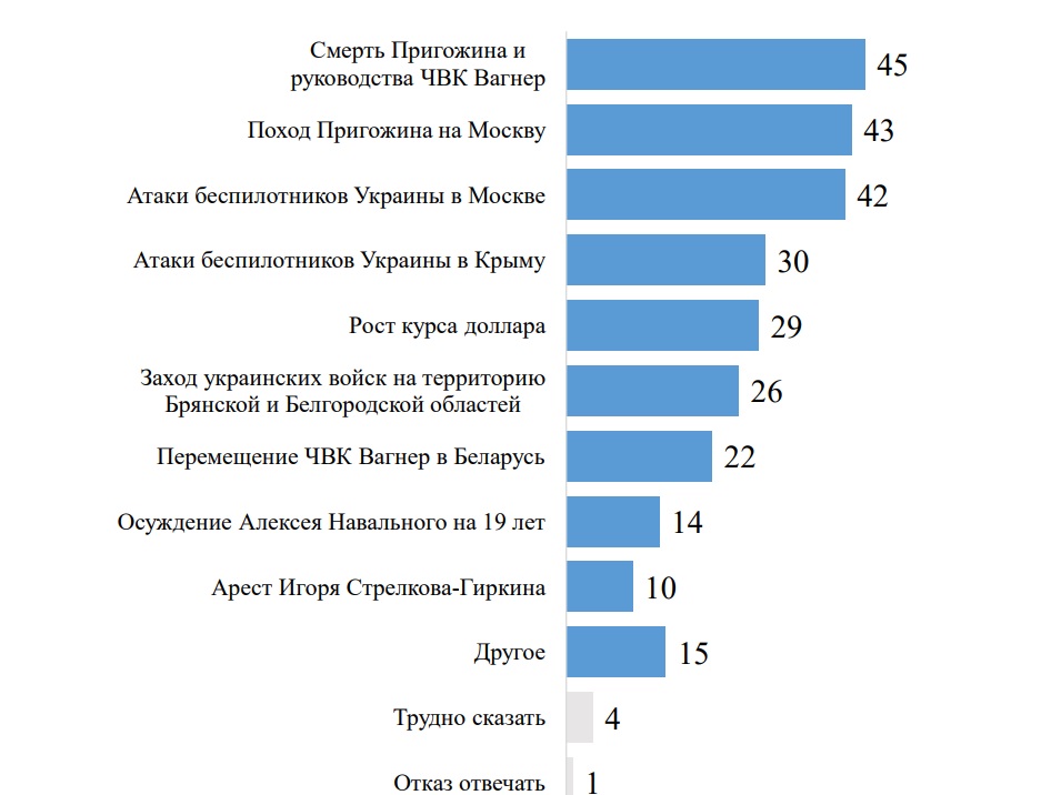 Отдельные события в варианте ответа «Другое»: атаки беспилотников по территории россии (в Брянской, Псковской, Курской, Воронежской, Белгородской, Тульской областях, в Москве и Санкт-Петербурге, на крымском мосту); роспуск ЧВК «Вагнер»; поставки Ф16 в Украину; десант украинской группы в Крыму; выход рос. армии из Роботино, отступление, утрата позиций; «провальное контрнаступление Украины»; повышение призывного возраста с 27 до 30 лет; саммит БРИКС в ЮАР; выступление папы римского; введение нового учебника истории в школе и новых школьных стандартов; взрыв в Махачкале на АЗС; наводнение в Приморском крае; крах Луны-25; встреча путина с Эрдоганом; рост цен на продукты, бензин и т.д.
