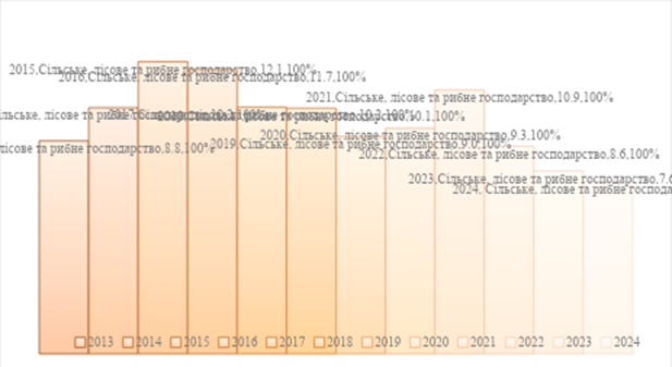 Однією із ключових ознак змін є частка аграрного сектору у ВВП. У 2013–2024 роках вона коливалася досить суттєво: від 8,8% у 2013 до 7,1 % у 2024 році, максимального значення 12,1% досягла 2015 року, після чого розпочалося поступове зниження (рис.1). Коротке відновлення у 2021 році (10,9 %), спричинене зростанням експорту, виявилося нестійким — уже з 2022 року показники стрімко впали через війну, руйнування логістики та скорочення виробництва.