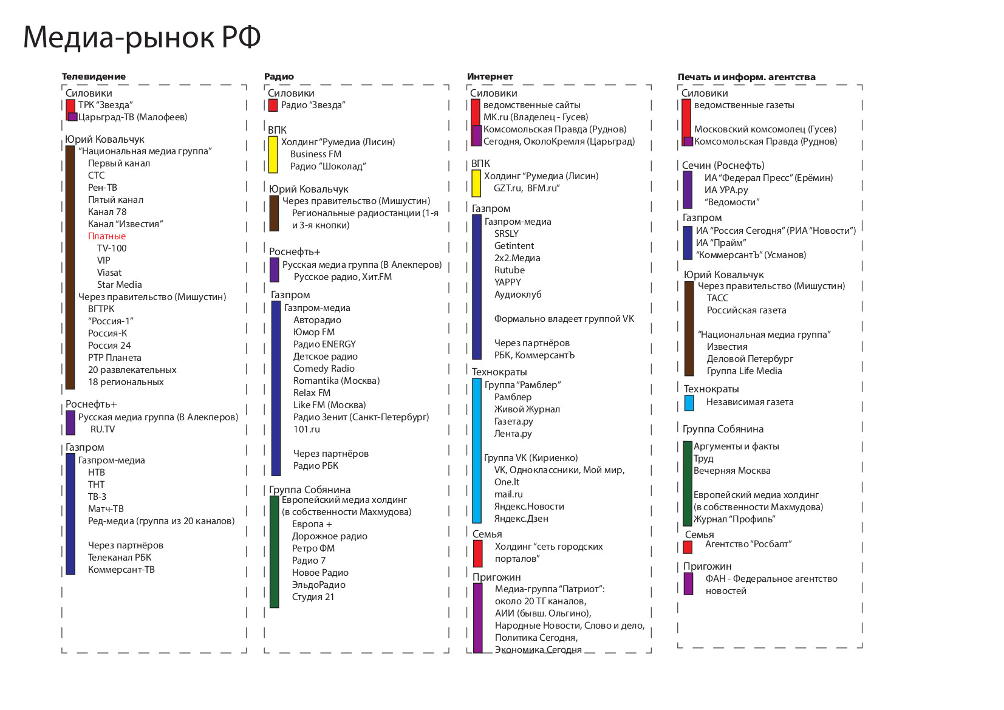 Для наглядности привожу примерную схему российского медийного поля с точки зрения принадлежности к сферам влияния ключевых группировок в окружении Путина (Башен Кремля) и ряда влиятельных политиков.