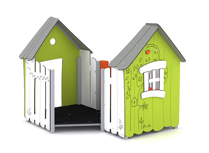 Два ярких домика соединены между собой заборчиком, что создает закрытое и уютное пространство, где дети могут почувствовать себя в собственном маленьком мире. Внутри одного из домиков установлен столик и скамейки, что делает этот модуль отличным местом для ролевых игр, воображаемой кофейни, магазина или просто зоны общения.