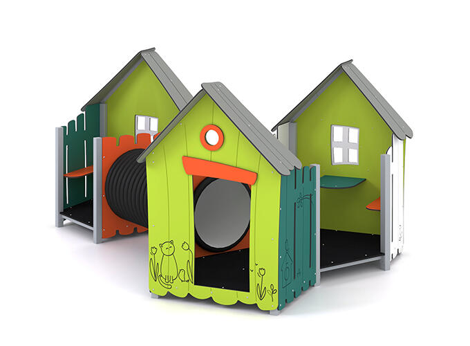 Игровой комплекс HUT-10 — это яркий, креативный и безопасный игровой комплекс, состоящий из трех домиков, соединенных между собой тоннелем, и дополненный внутренним столиком и скамейками, что превращает игровое пространство в уютную среду для всестороннего развития ребенка.
