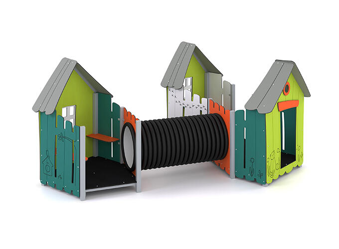 Благодаря тройной архитектуре, дети могут взаимодействовать в различных пространственных зонах: переходить из одного домика в другой, увлеченно передвигаться по туннелю или просто устраиваться за столиком, чтобы пообщаться с друзьями. Визуально комплекс оформлен в природной стилистике с мягкими зелеными и белыми тонами, декоративными окошками и элементами с рисунками животных и растений — все это делает его еще более привлекательным для детей.